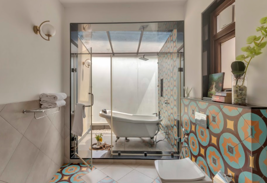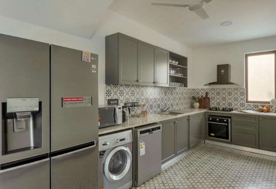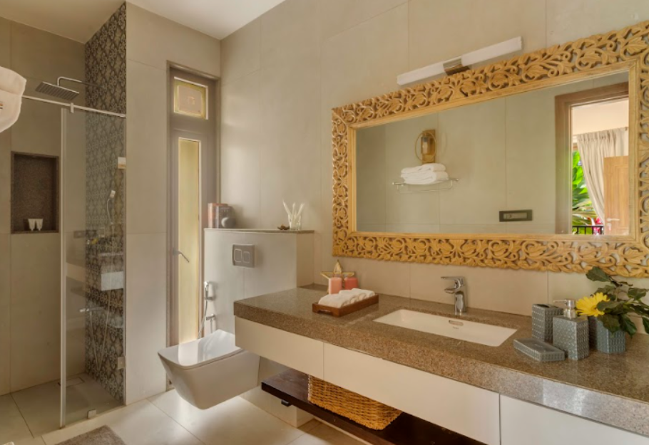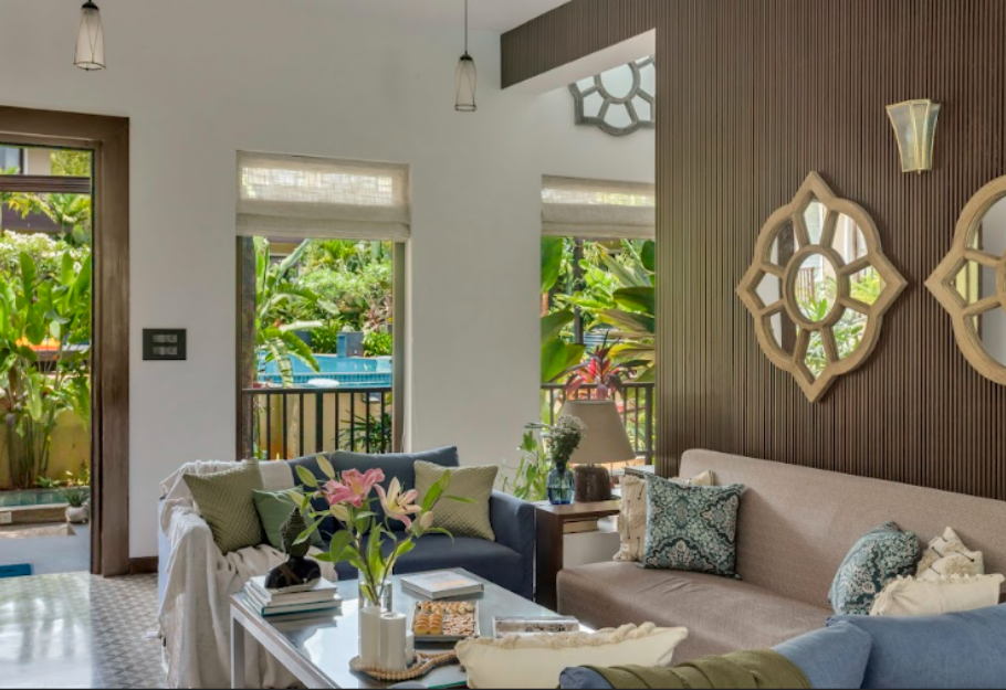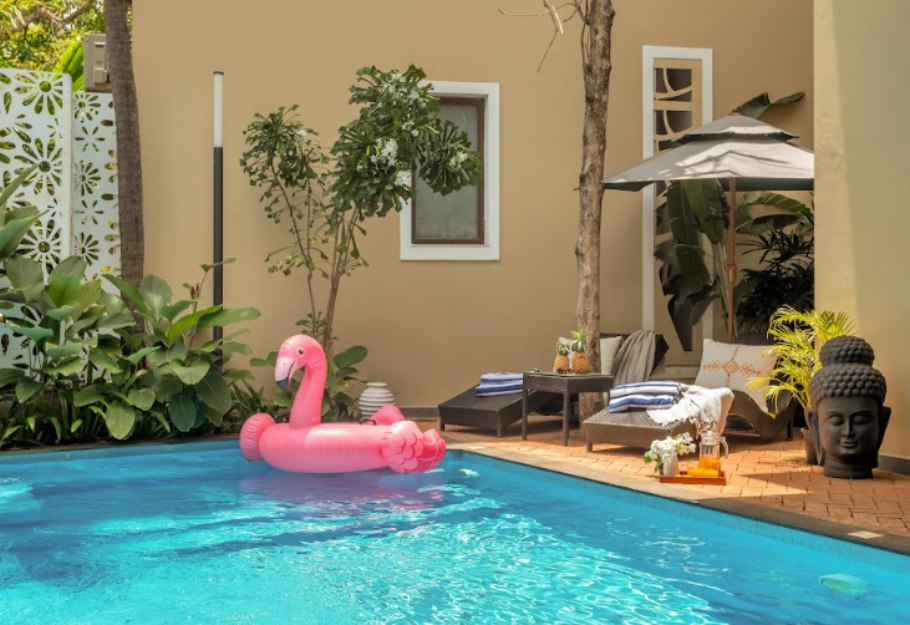 Large windows decorate the seating area, giving you a perfect view of the serene blue pool and the deck. It is set in warm hues, and decorated with accents that are an amalgamation of contemporary finishes and modern touches, lending a luxurious aura to the entire space. What's unique about this property? You will have a private pool in your villa as well as a huge common pool. Now, who doesn't love a massive pool to spend the day in?